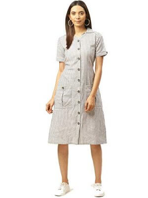 Cottinfab Women Off-White & Black Striped Shirt Dress At Sale Price In India