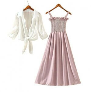 P.C Perry Collection Women’s Fit and Flare Stylish Ankle Length Long Maxi Dress with White Shrug – Pink and White at Sale Price in India