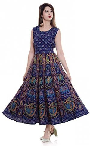 UNIBLISS Women’s Cotton Rajasthani Jaipuri Traditional Printed Kurti Long Midi Maxi Dress – Multi1 at Sale Price in India