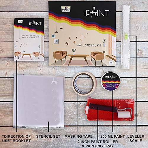 Berger iPaint DIY Wall Diya Stencil Painting Kit (2″ Foam Roller, Painting Tray, 200 ml Silk Glamor Paint Burnt Chilli, Stencil Set, Masking Tape, Leveller Scale, DOU Booklet)- Multicolor at Discount Price in India