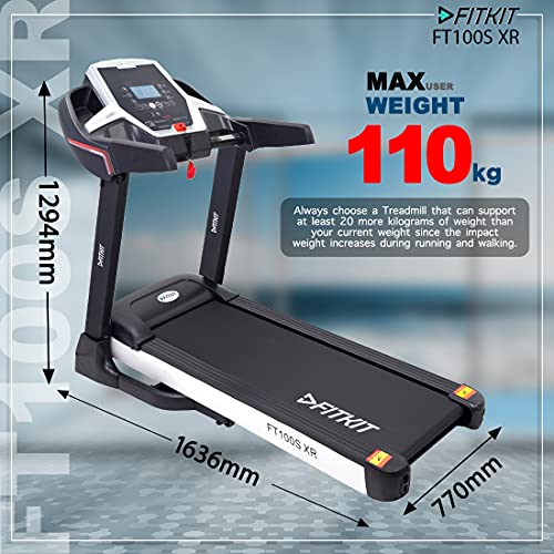 Specification: Fitkit FT100S XR Series (3.25HP Peak) DC-Motorised Treadmill ( Max Speed:14 km/hr, Max Weight: 110 Kg ) With Free home installation and Connected Live interactive Sessions by Onefitplus at Sale Price in India
